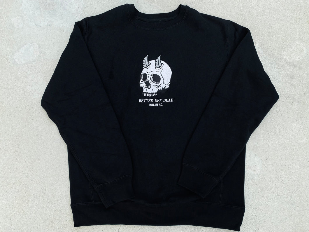 Original "Better Off Dead" skull design embroidered on a super heavyweight crewneck sweater. 13.5oz 100% ringspun cotton fleece.